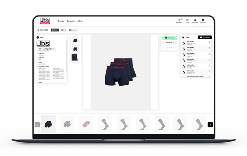 I 2024 hjalp vi JBS med et digitalt pre-order system, som sælgerne kan bruge til at præsentere og sælge nye kollektioner online. Et nyt digitalt showroom, hvor de kan fremvise varer og tage imod forhandlernes bestilling online. Nemt for både sælgere, kunder og agenter.
